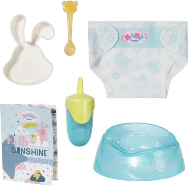 Setul include o sticlă, suzetă, suzetă cu șnur, scutece și alte accesorii pentru îngrijire și joacă completă.