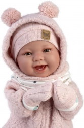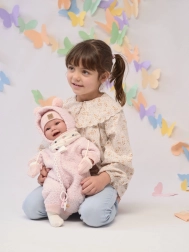 Adorabilul bebeluș LLORENS NEW BORN cu corp textil moale și sunete realiste va încânta orice copil. La apăsarea pieptului începe să râdă și să spună „mama”, „tata”. Are membre articulate pe articulații, poate sta în șezut și vine într-o cutie cadou. Realizat manual în Spania, mărime 44 cm, recomandat de la 3 ani.