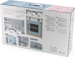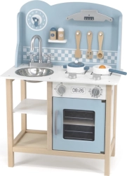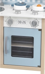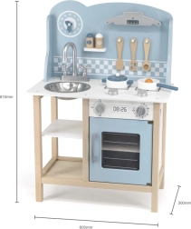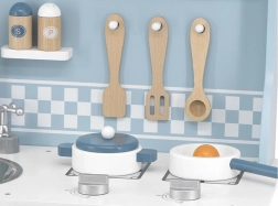Bucătăria din lemn, în nuanțe polare, îmbină un design atemporal cu o execuție de calitate. Copiii găsesc în ea tot ce știu dintr-o bucătărie adevărată – chiuvetă, cuptor, plită și hotă – plus un spațiu de depozitare cu poliță pentru alimente și veselă. Suprafața este finisată cu vopsele netoxice și sigure, iar toate marginile sunt netede pentru un joc în siguranță.