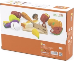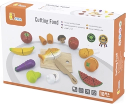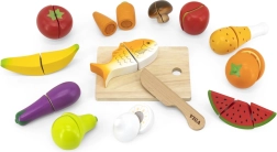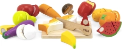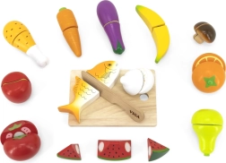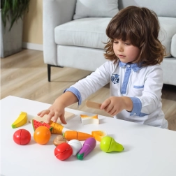 Acest set din lemn de înaltă calitate include o selecție variată de fructe, legume și alte alimente – de la banană și pepene la morcov, roșie sau pește. Copiii pot exersa în siguranță tăierea cu cuțitul de lemn pe tocător și pot învăța să recunoască diferitele tipuri de alimente, culorile și formele. Ideal pentru joacă independentă sau „gătit” împreună cu părinții.
