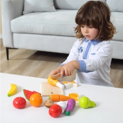 Piesele sunt rezistente, plăcute la atingere și dimensionate pentru palmele mici ale copiilor. Datorită sistemului de „tăiere” cu îmbinare, alimentele se pot reasambla ușor, astfel încât joaca nu devine plictisitoare și antrenează în mod natural răbdarea, concentrarea și îndemânarea manuală.
