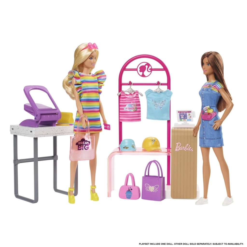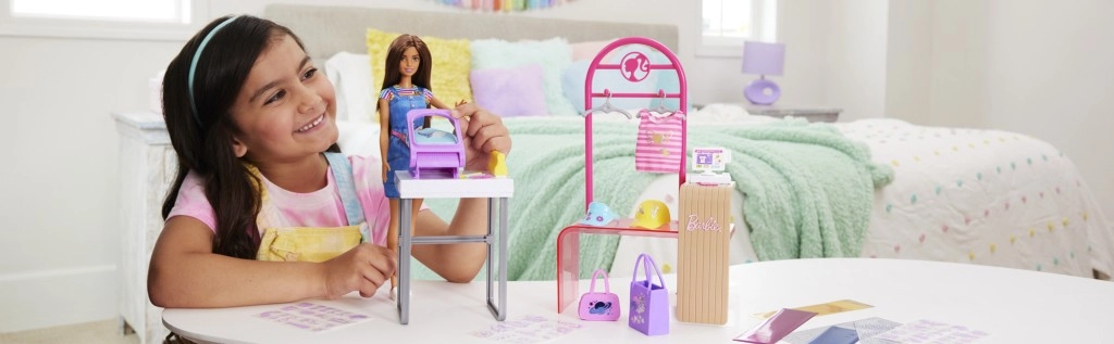 Setul de joacă Barbie Studio de design vestimentar cu păpușă le permite copiilor să își deschidă propriul butic cu hăinuțe și oferă trei moduri de joacă: proiectare de ținute, realizare și vânzare. Micii creatori de modă pot crea ținute unice folosind funcția de serigrafie pe folie și le pot decora cu autocolante reutilizabile pentru peste 150 de look-uri diferite. Suportul pentru haine cu umerașe este ideal pentru agățarea ținutelor create, expunerea lor și ambalarea pentru vânzare. Păpușa nu poate sta în picioare fără sprijin. Vârsta 5+