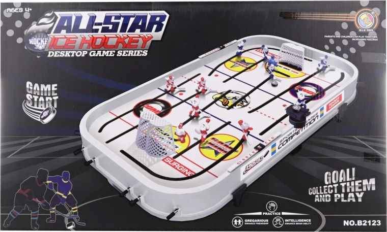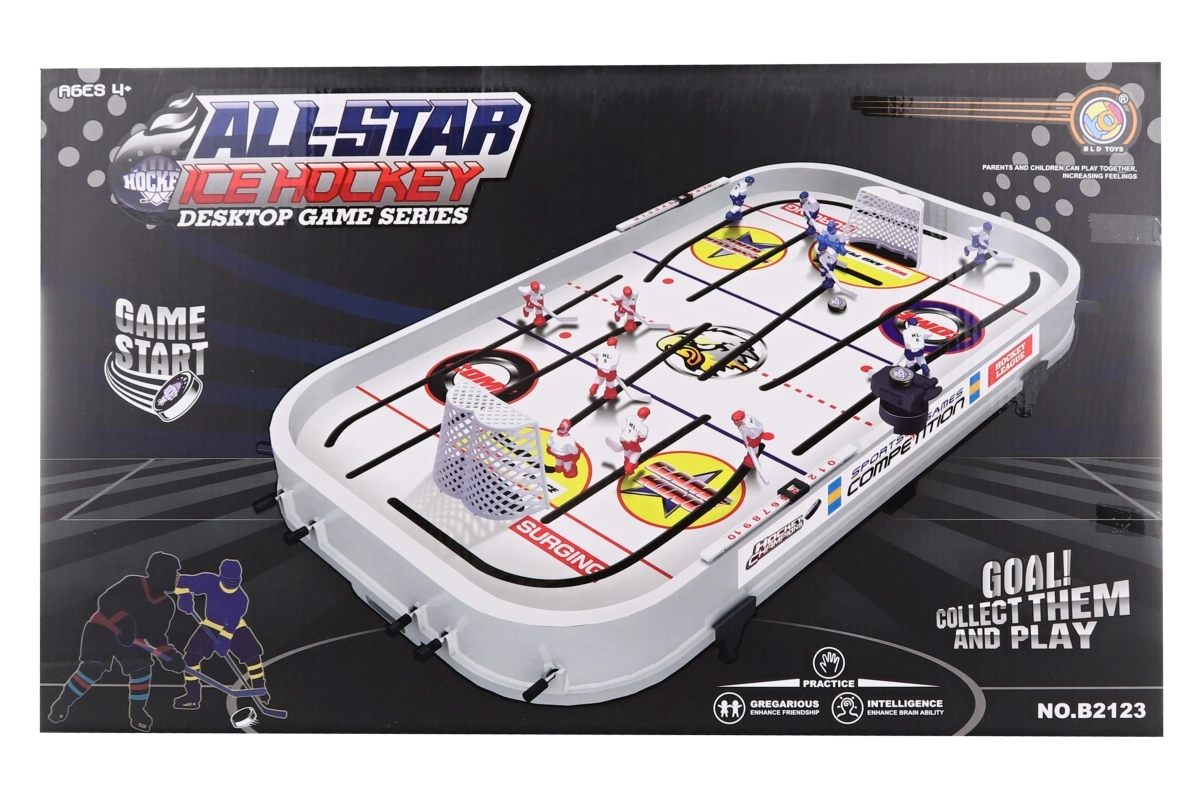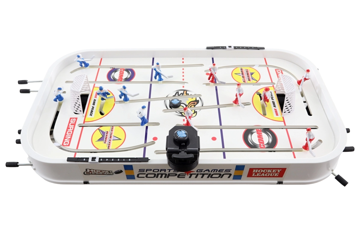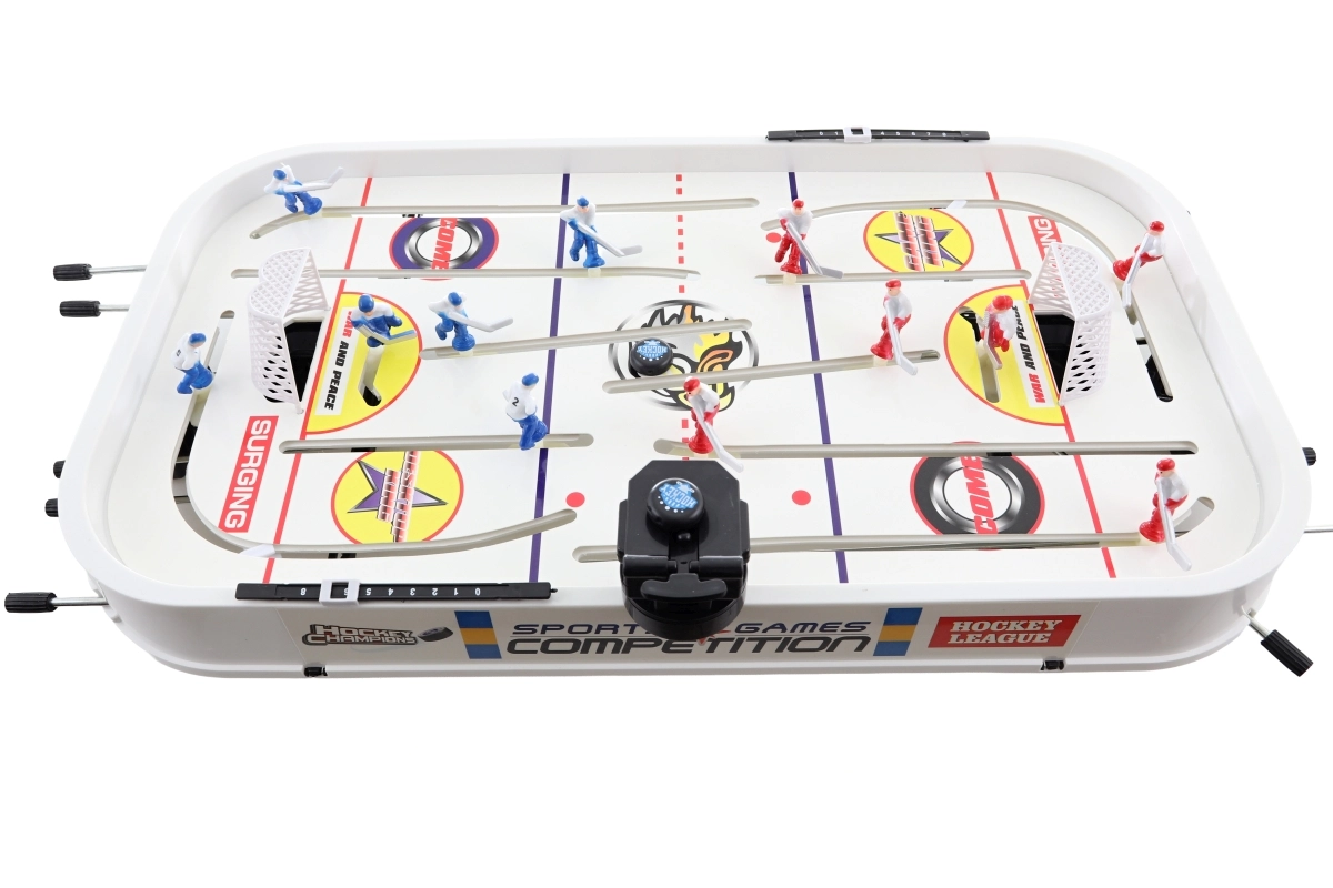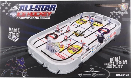 Dimensiunile ambalajului, aprox. 59,5 × 35,5 × 8 cm, permit transport și depozitare ușoare. Tijele de control oferă mișcare cursivă a jucătorilor și șuturi line, pe placul fanilor mici și mari ai hocheiului.