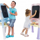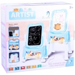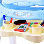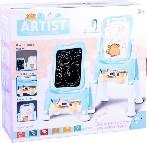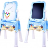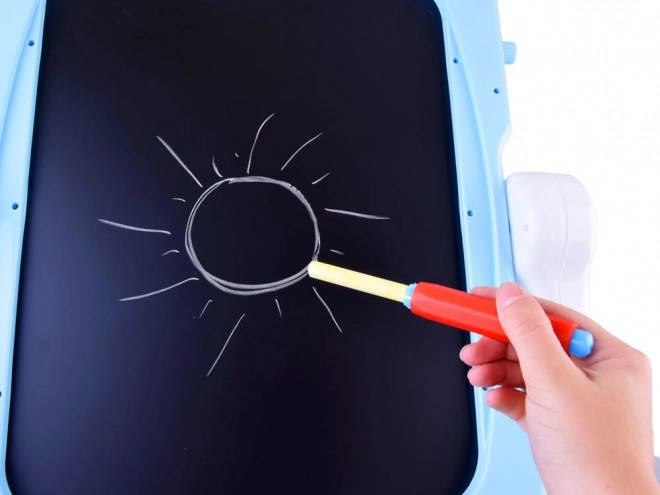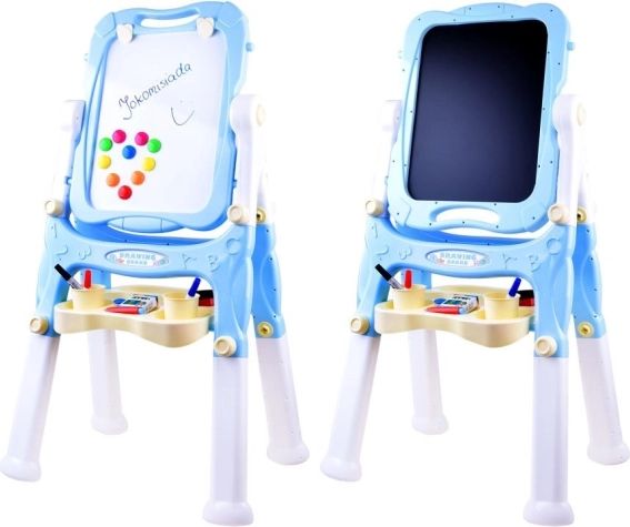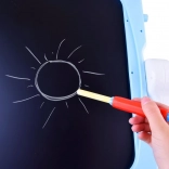 Această tablă de pictură stabilă, cu ramă albastru pastel, susține creativitatea și învățarea. O parte este magnetică pentru markere dry-erase și pentru fixarea magneților sau a hârtiei, cealaltă este clasică, neagră, pentru desen cu cretă colorată. Datorită poliței practice, paharelor și suporturilor, veți avea mereu toate accesoriile la îndemână.