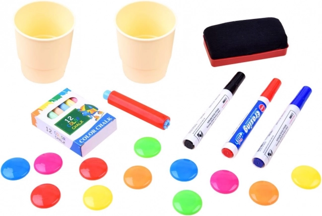 Pachetul include magneți, markere dry-erase cu burete, cretă colorată, suport pentru cretă și o poliță pentru ustensile.