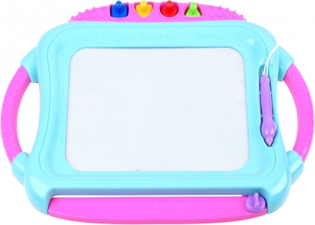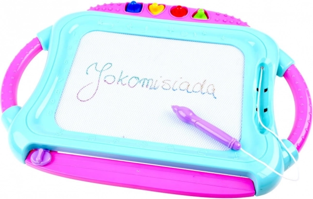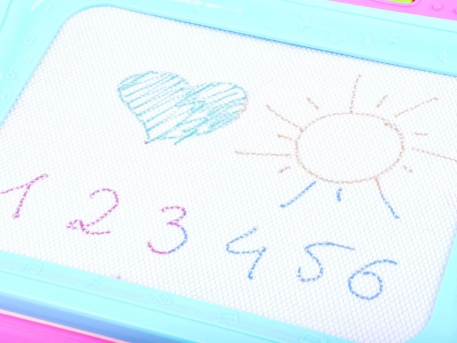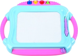 Această tablă magnetică colorată permite desenul și scrisul fără murdărie. Fundalul în patru culori își schimbă nuanțele în funcție de locul desenului, astfel încât fiecare imagine capătă un efect viu, multicolor. Copiii pot crea cu stiloul sau pot imprima forme cu ștampilele, dezvoltându-și astfel imaginația și coordonarea mână–ochi.
