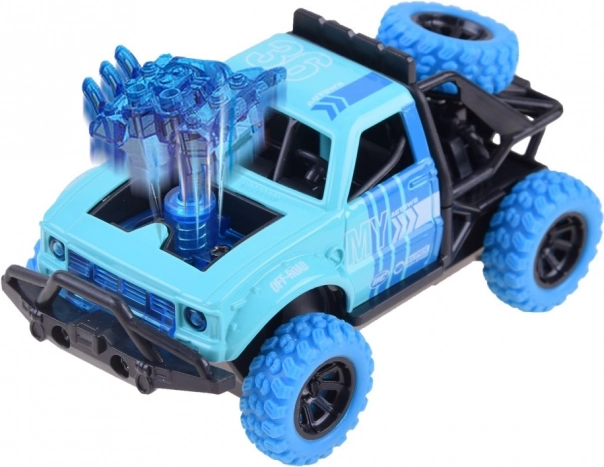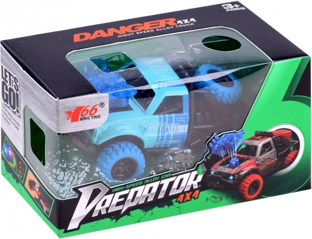 Mașinuța metalică 4x4 Predator oferă curse pline de acțiune cu mecanism cu arc (pull-back), efecte luminoase și sunete realiste de motor, impact și alarmă. Datorită construcției rezistente cu caroserie metalică, anvelope din cauciuc și șasiu solid, face față și cascadoriilor îndrăznețe.