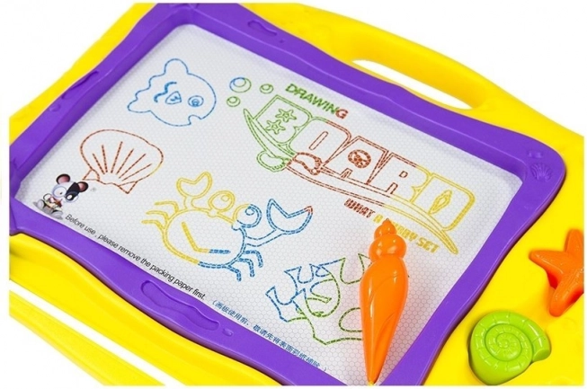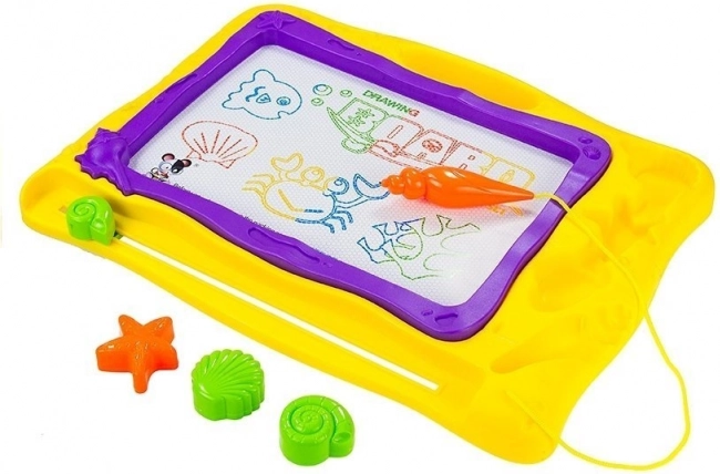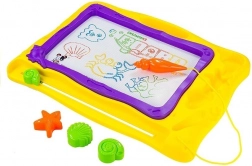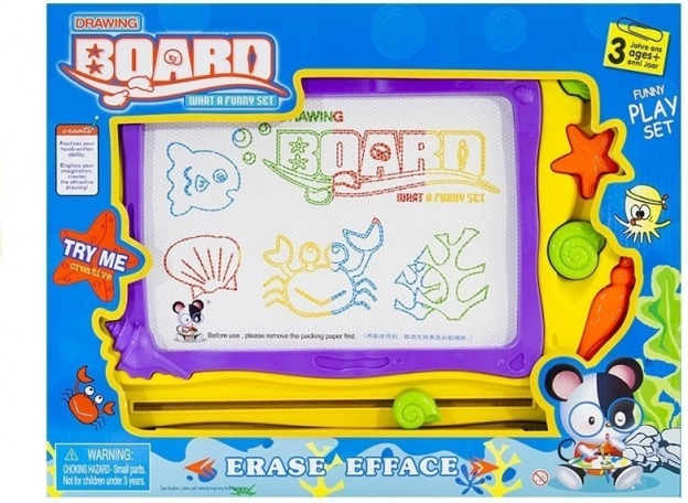 Fundalul colorat împărțit în 8 secțiuni oferă viață fiecărei lucrări și stimulează imaginația copiilor. Designul marin cu scoici și stele de mare îi va încânta pe micii iubitori ai oceanului. Execuția de calitate asigură durabilitate și utilizare sigură – desenați doar cu stiloul magnetic inclus.