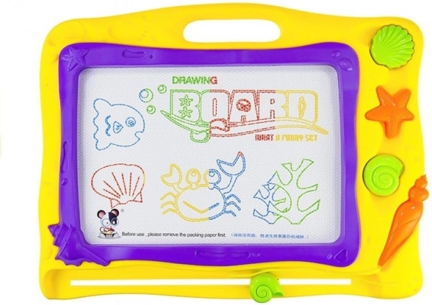 Tabla magnetică este o alegere excelentă pentru desen fără hârtie și fără murdărie. Sub ecran se află pilitură metalică, care la atingerea stiloului magnetic se aranjează în imagini. Pentru a le șterge este suficient să glisați ușor cursorul de ștergere din partea de jos, iar suprafața este gata pentru o nouă creație.