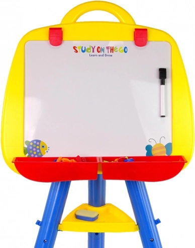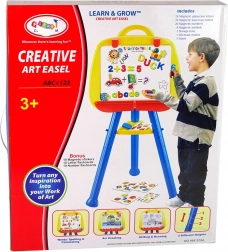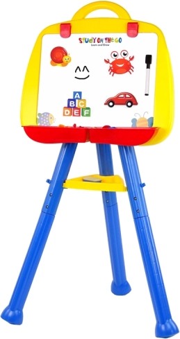 Tabloul este echipat cu cleme pentru a fixa hârtia exact ca pe un șevalet adevărat. De asemenea, include două containere pentru materiale artistice, cum ar fi pastelurile și markerele. Tabloul este conceput pentru a putea fi ajustat la diferite înălțimi, în funcție de statura copilului tău.