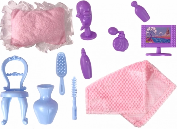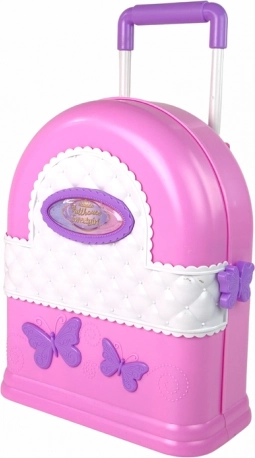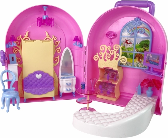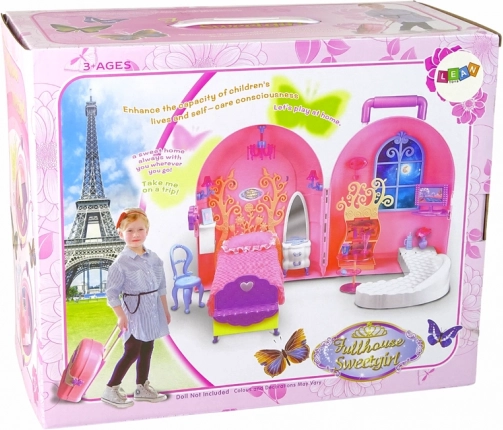 Când este pliată, căsuța seamănă cu o valiză foarte feminină, în culori pastel, cu toartă lungă. Culorile roz și mov aprins sunt combinate cu accesorii albe, ceea ce cu siguranță va plăcea oricărei fete. Interiorul valizei ascunde un set complet de obiecte necesare pentru joaca cu păpușa.