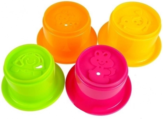 Setul conține pahare stivuibile colorate cu motive de pasăre, vierme și iepure pentru distracție suplimentară.