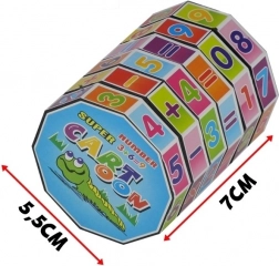 Un puzzle cilindric colorat cu inele rotative îi ajută pe copii să dobândească în joacă bazele matematicii. Datorită numerelor și simbolurilor, copiii exersează adunarea, scăderea, înmulțirea și împărțirea, oricând și oriunde. Construcția durabilă din materiale sigure respectă standardul EN 71, este potrivită de la 3 ani, iar dimensiunile compacte 7 × 5,5 cm îl fac un ajutor ideal pentru călătorii.