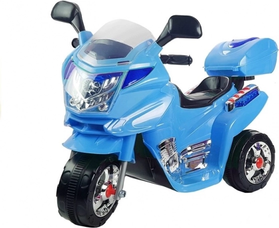Versiunea albastră a motocicletei pe baterii impresionează de la prima vedere prin culorile sale neobișnuite, precum și prin designul și ornamentele sub formă de autocolante contrastante multicolore caracteristice vehiculelor adevărate. Caroseria bleu, realizată din plastic ABS rezistent și solid, este prevăzută cu elemente modelate care conferă vehiculului un aspect foarte modern și original. Această impresie este intensificată de imitațiile elementelor cromate ce amintesc de sistemul de evacuare, care cu siguranță va atrage atenția oricărui copil. De asemenea, este foarte relevant designul triunghiular, care facilitează conducerea pentru copiii mici ce au dificultăți în a-și menține echilibrul în timpul mersului. Distracția n-a fost niciodată mai ușoară!