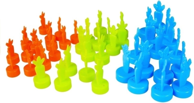 Jocul conține morcovi din plastic colorat în portocaliu, verde și albastru, care reprezintă diverse valori de punctaj. Aceste elemente sunt ideale pentru jocuri distractive și vizual atrăgătoare.