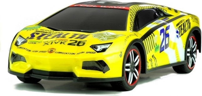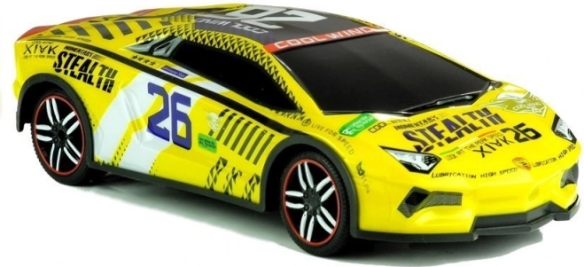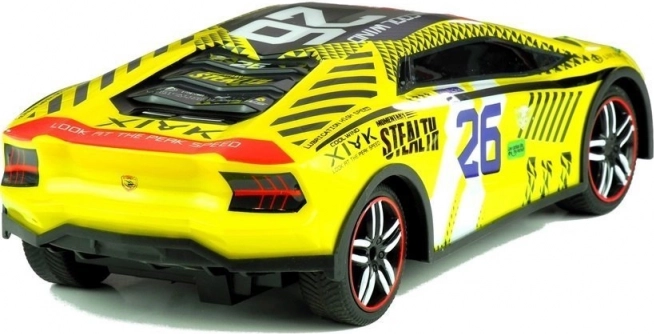 Caroseria galbenă cu stickere detaliate și numărul 26 la scară 1:14 arată fidel și invită la curse acasă și în aer liber.