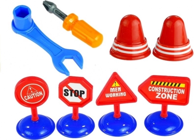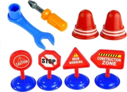 Setul include figurine, unelte și semne de circulație, care învață copiii despre lumea lucrătorilor de reparații și instrumentele de bază prin joc.
