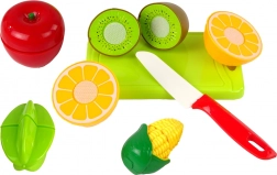 Cuțitul din plastic și fructele cu prindere cu arici le permit copiilor să exerseze tăierea în deplină siguranță. Repetarea îmbinării jumătăților dezvoltă motricitatea fină și precizia.