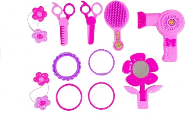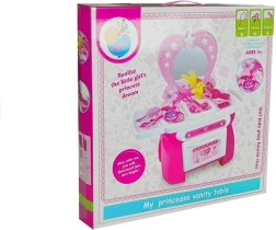 Toaletă pentru copii cu accesorii de înfrumusețare este ideală pentru fetițele care adoră să imite mamele și surorile mai mari. Această frumoasă măsuță roz cu oglindă în formă de inimă este completată de: