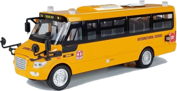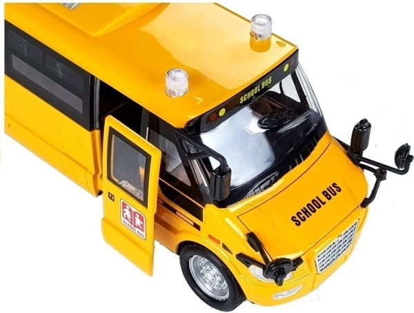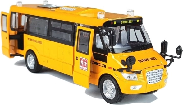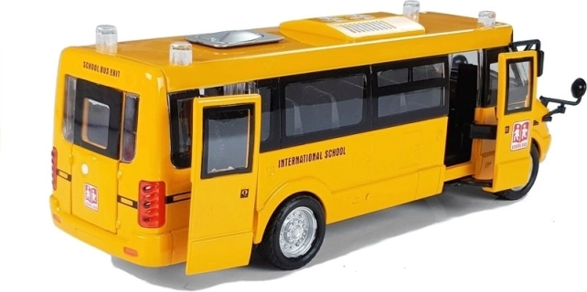 Ușile laterale și din spate, precum și capota se deschid; ferestrele transparente și micile detalii precise (oglinzi, capace, inscripții) redau aspectul autentic al unui autobuz școlar.
