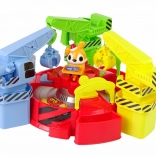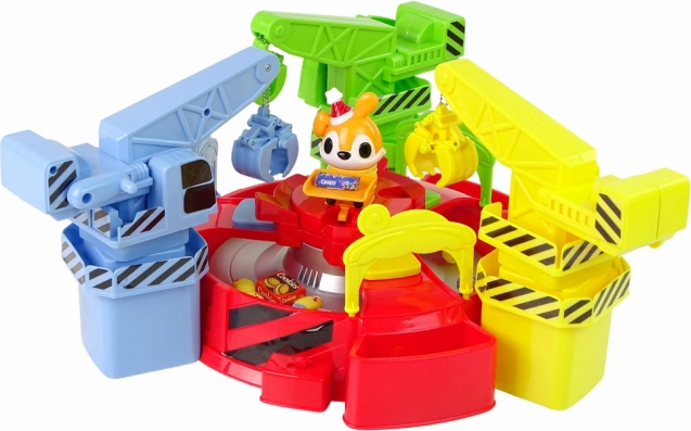 În pachet găsiți: carusel, 3 capace, macaralele galbenă, verde și albastră, 4 ouă, 5 biluțe, 3 imitații de ciocolată, 3 biscuiți, 3 bomboane și 3 gume de mestecat.