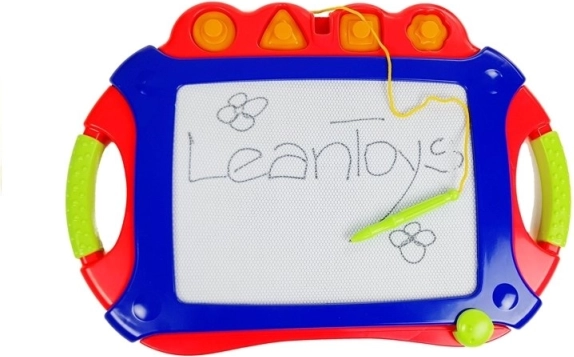Setul prezentat este alcătuit din o placă de dimensiuni impresionante, un stylus și patru ștampile în formă de figuri geometrice. Marea tablă magnetică este realizată din culori neutre, plăcute culorile clasice vor fi pe placul fetelor și băieților.Pe laterale există mânere pentru transportul ușor al jucăriei.