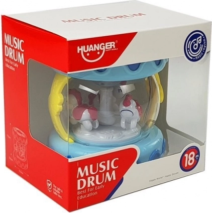 Cu bază albastră și partea superioară stilizată, toba aduce bucurie și sprijin în explorarea muzicală a copiilor.