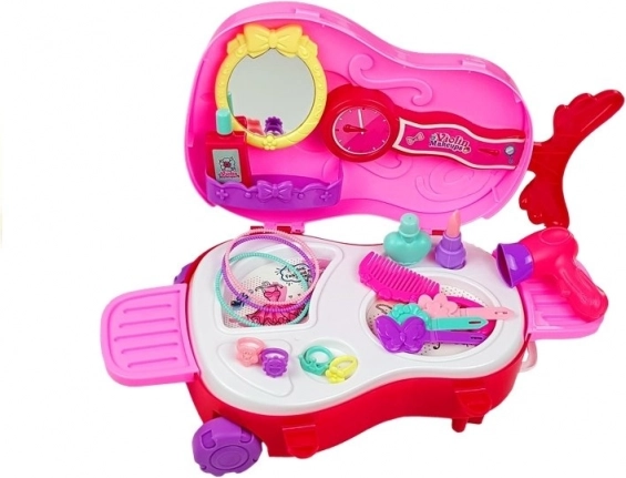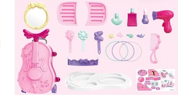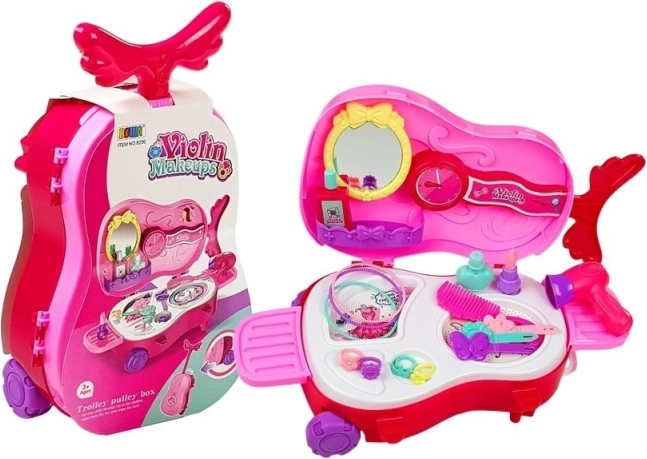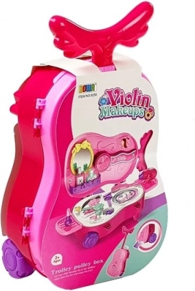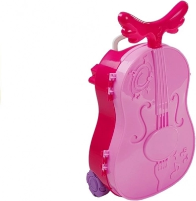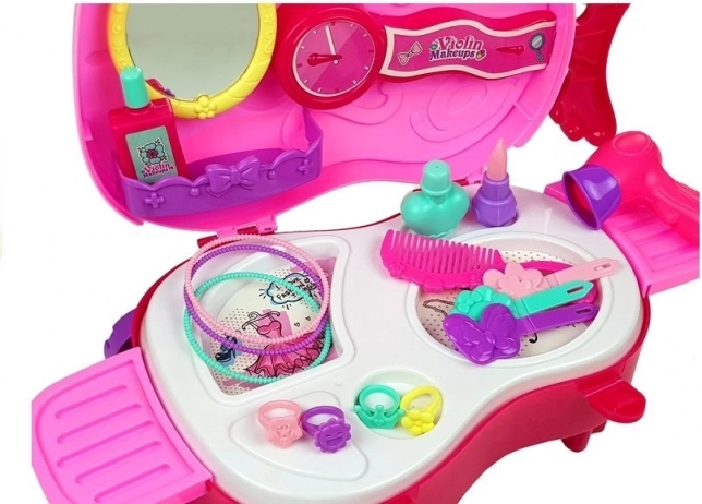Măsuța de toaletă portabilă într-o valiză roz în formă de vioară oferă copiilor posibilitatea de a avea grijă de aspectul lor într-un mod jucăuș. Conține diverse accesorii din plastic care trezesc imaginația fiecărui mic artist vizual.