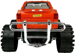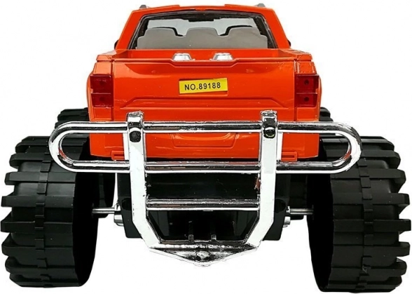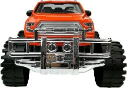 Camion portocaliu cu suspensie evidentă, grilă cromată și construcție robustă pentru joacă în casă și în aer liber.