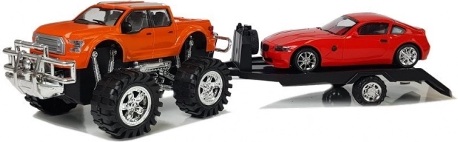 Descoperă setul perfect pentru micii pasionați de mașini: un monster truck portocaliu cu roți mari, remorcă de tractare și mașină sport roșie. Construcția robustă din plastic garantează durabilitate și viață lungă, iar combinația dintre camionul off-road și remorcă oferă joacă dinamică și creativă atât în interior, cât și afară.