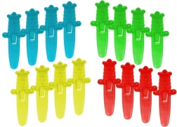 - Conținutul pachetului: pirat, butoi cu orificii, 16 săbii colorate (4× galbene, roșii, verzi, albastre), roata norocului cu culori