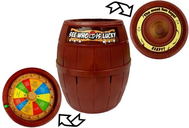 - Pirat, butoi cu orificii, 16 săbii colorate, roata norocului cu culori