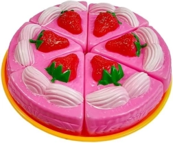 Include un tort roz cu căpșuni și cremă care arată realist, pe care copiii îl pot tăia și servi.