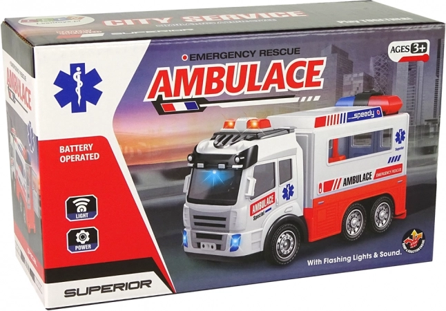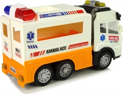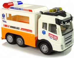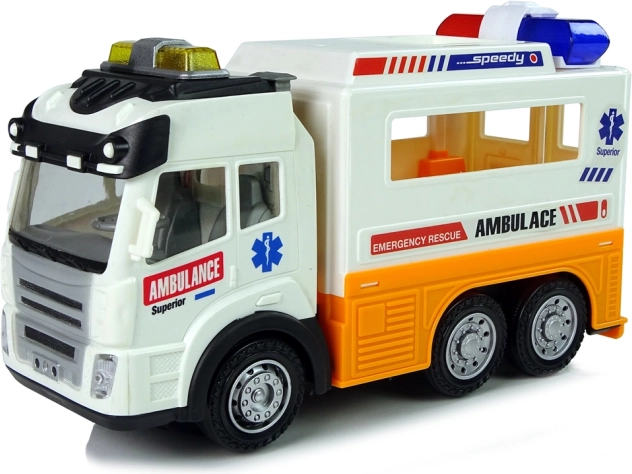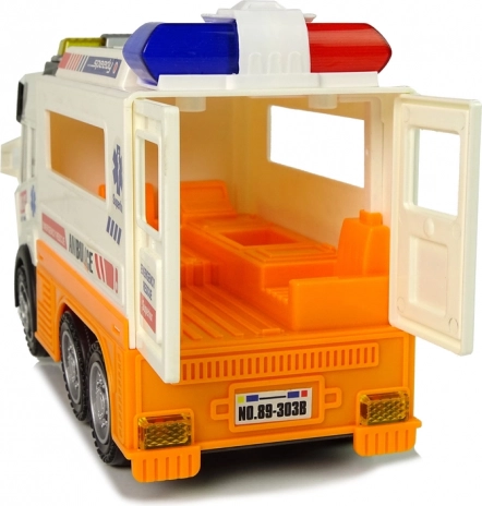Ambulanța auto pe baterii cu efecte de lumină și sunet va cuceri toți băieții care adoră vehiculele. În spate, ușile se pot deschide, dezvăluind un interior detaliat cu un pat și un loc pentru echipamente medicale. Jucăria este realizată în alb frumos cu elemente portocalii și inscripții tipice pentru o ambulanță.< /p>