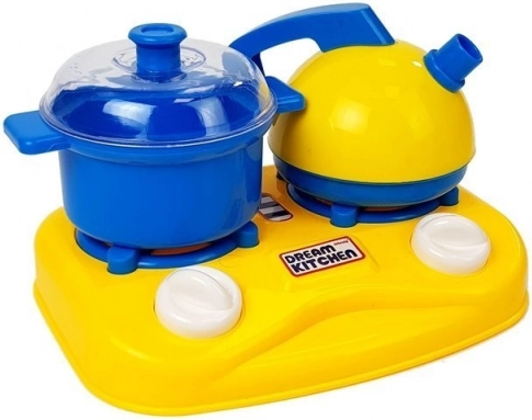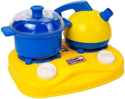 Aragaz, ceainic, oale cu capace, tigaie, ceșcuțe cu farfuriuțe și ustensile practice – copiii pot găti, amesteca și servi ca adulții.
