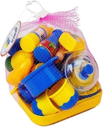 - Conținut bogat: aragaz, ceainic, oale cu capace, tigaie, ceșcuțe cu farfuriuțe, tacâmuri, tocător, ustensile de bucătărie, machete de alimente și sticluțe cu condimente.