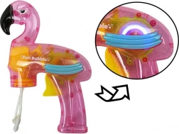 Acest set de distracție pentru producerea bulelor constă într-un pistol în formă de flamingo și două sticle cu soluție de rezervă. Doar deschideți capacul sticlei, îndepărtați protecția și înșurubați în pistol. Este suficient să apăsați declanșatorul și din pistol vor începe să iasă bule frumoase, colorate.