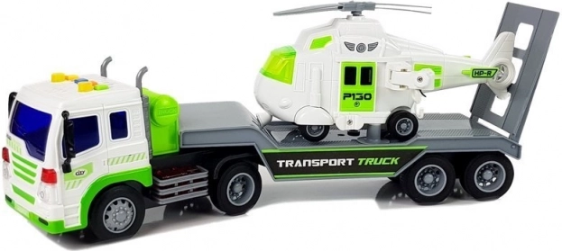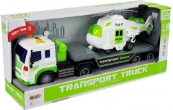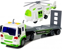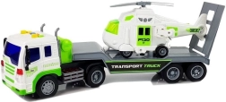Acest camion de transport redat în detaliu, în combinație alb-verde, are o platformă lungă pentru încărcarea comodă a elicopterului sau a altor vehicule. Rampa rabatabilă din spate ușurează urcarea și fixarea în siguranță a încărcăturii. Distracția este asigurată de efectele luminoase și sonore – pe acoperișul cabinei se află 4 butoane pentru pornire motor, claxon, sunet de mers și de marșarier. Datorită mecanismului cu fricțiune, este suficient să tragi mașina înapoi și să o lași să plece.