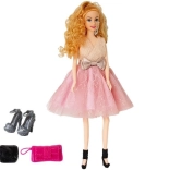 Păpușă manechin stilată cu păr blond în rochie roz pal cu fundă care va bucura orice mică iubitoare de modă. În pachet găsiți elegante pantofi cu toc, poșetă și aparat foto pentru joacă și mai creativă. Păpușa este ideală pentru prezentări de modă și scenete, are machiaj delicat și este un cadou grozav pentru copii de la 3 ani.