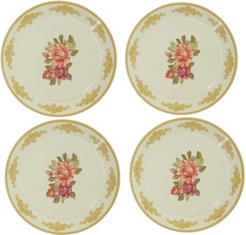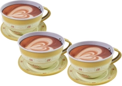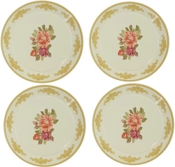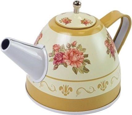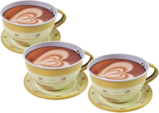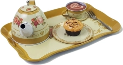 Setul include 4 cești cu farfurioare, 4 farfurii pentru desert, un ceainic, o tavă și un suport etajat pentru prăjituri.