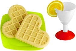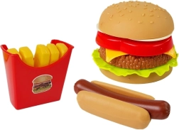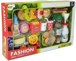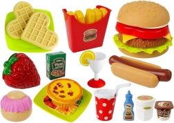 Setul include diverse alimente precum hot dog, cartofi prăjiți, gofre și multe altele. Toate piesele sunt fabricate din plastic sigur și rezistent, potrivit pentru copiii peste trei ani și certificat conform standardului CE. Dimensiunile pieselor variază de la 7 cm pentru cartofii prăjiți până la 12 cm pentru sucul de cocos, ideale pentru mâinile mici ale copiilor.