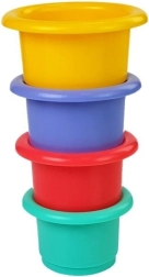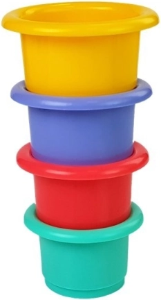 Setul include patru găletușe de culori diferite cu orificii pentru a observa fluxul apei.