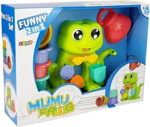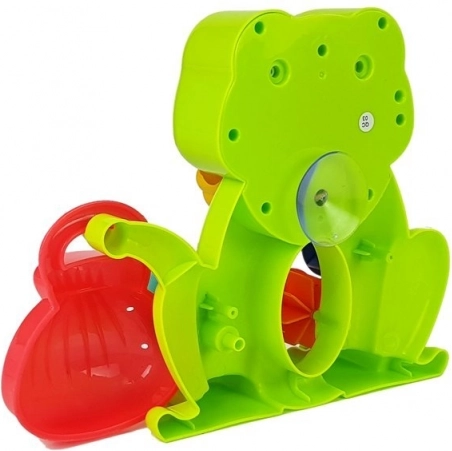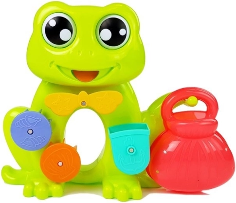 Această broască adorabilă cu elemente rotative atrage copiii la joacă în cadă. După ce apa este turnată în căpșorul ei, se declanșează o mică roată de apă, care pune în mișcare un flux de apă prin gura broaștei. În plus, broasca are ochi care se rotesc când apa curge, captând și amuzând fiecare copil.