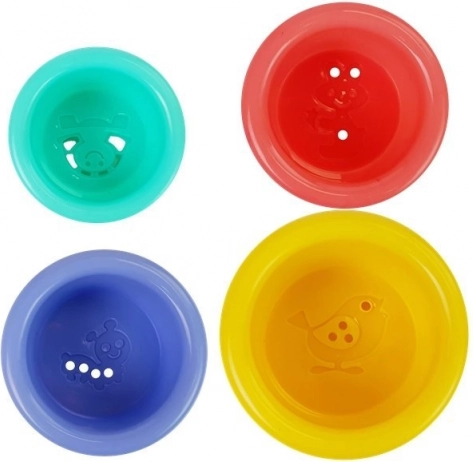 Setul include 4 găletușe colorate diferit, care pot fi stivuite. La baza lor sunt găuri de dimensiuni variabile, prin care se pot observa diferite fluxuri de apă. Fiecare găletușă este decorată cu forme sculptate de animale, cum ar fi o păsărică, o râmă, un iepuraș și o țestoasă. Această jucărie nu este doar distractivă, dar ajută și copiii să învețe culorile și să își dezvolte abilitățile motorii.
