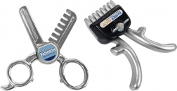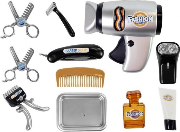 La apăsarea mânerului, fohnul pune în mișcare tamburul colorat din interior, iar mașina de tuns, la glisarea butonului lateral, redă sunet autentic de tăiere. Setul include totul, de la pieptene, oglindă și foarfece sigure până la trimmer, brici de joacă și sticluțe pentru „cosmetice”.