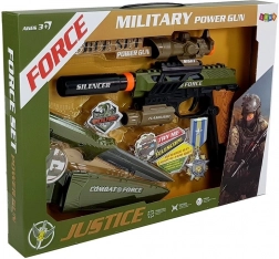 Set militar pentru copii, ideal pentru micii fani ai acțiunii: include pistol cu efecte luminoase și sonore, cuțit din cauciuc cu teacă și medalie. Realizat din plastic de calitate, în verde armată, perfect pentru joc creativ și ca accesoriu pentru costum. Pistolul oferă împușcare cu sunete, efecte luminoase, amortizor, vizor și lanternă. Potrivit de la 3 ani, bateriile sunt incluse.