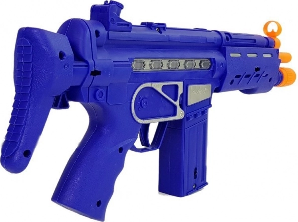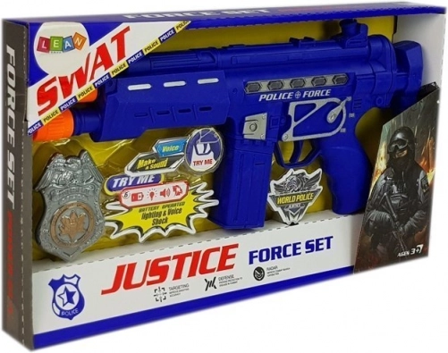 Acest set de poliție este o alegere excelentă pentru micii apărători ai ordinii. Pistolul cu aspect realist, în culoare albastru închis, se ține ușor în mână; la apăsarea trăgaciului emite sunet de foc, activează efecte luminoase și vibrații, intensificând experiența de joc. Setul include și o insignă, datorită căreia copilul intră ușor în rolul polițistului.