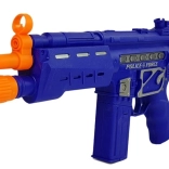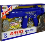 - Setul include un pistol de culoare albastră și o insignă, ambele realizate din plastic de înaltă calitate pentru o durabilitate îndelungată