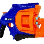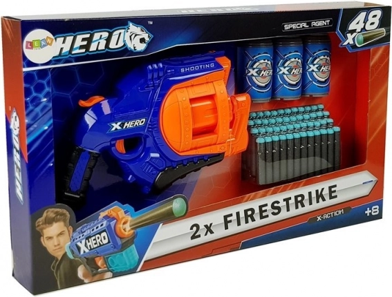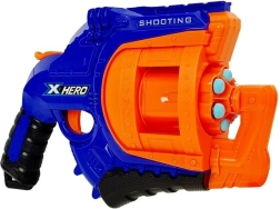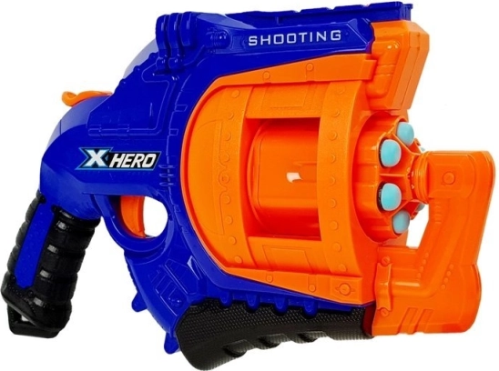 Pistolul are o magazie rotativă pentru 6 proiectile. Pentru a trage un proiectil, este suficient să trageți declanșatorul în jos și să apăsați pe trăgaci! Numărul mare de proiectile permite o distracție nesfârșită. Setul include și doze pe post de ținte!