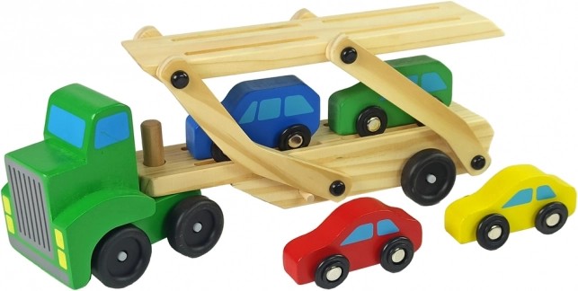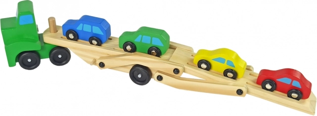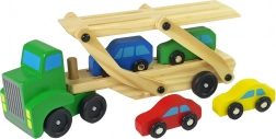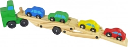 Această autospecială din lemn cu platformă de remorcare va încânta orice mic fan al motoarelor. Setul include un vehicul de marfă robust cu platformă de remorcare pe două niveluri și 4 mașinuțe colorate. Datorită rampei rabatabile (pliabile), mașinuțele pot urca ușor pe platformă și pot fi transportate în siguranță.